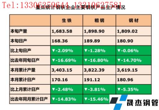 2月24日訊,2月中旬,重點統計鋼鐵企業共生產粗鋼1898.9萬噸、生鐵1683.58萬噸、精密鋼管1809.02萬噸。其中,粗鋼日產189.89萬噸,環比下降1.28%;生鐵日產168.36萬噸,環比下降2.09%;精密鋼管日產180.9萬噸,環比下降0.06%。精密鋼管庫存量1690.35萬噸,比上一旬增加4.95萬噸,增長0.29%;比去年同期減少64.38萬噸,下降3.67%。